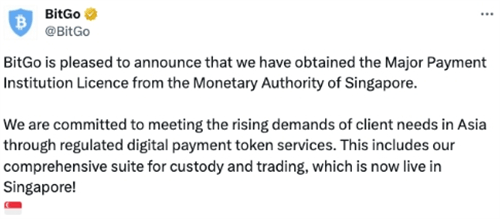 BitGo自2024年1月起便原则上获得了该许可证的批准,经过数月的筹备,现已正式获得授权,开始在新加坡提供受监管的数字支付代币服务,如托管和交易等。此前,BitGo虽已在新加坡及亚太地区提供服务,但主要限于技术性的托管服务和热钱包,并未涉及受监管产品。